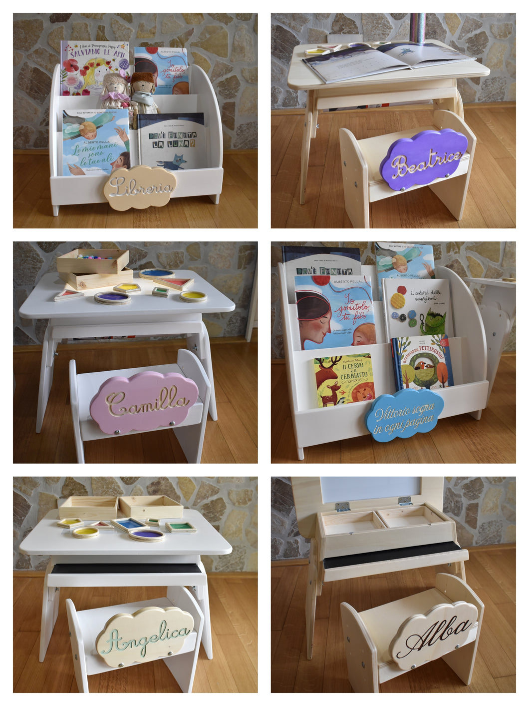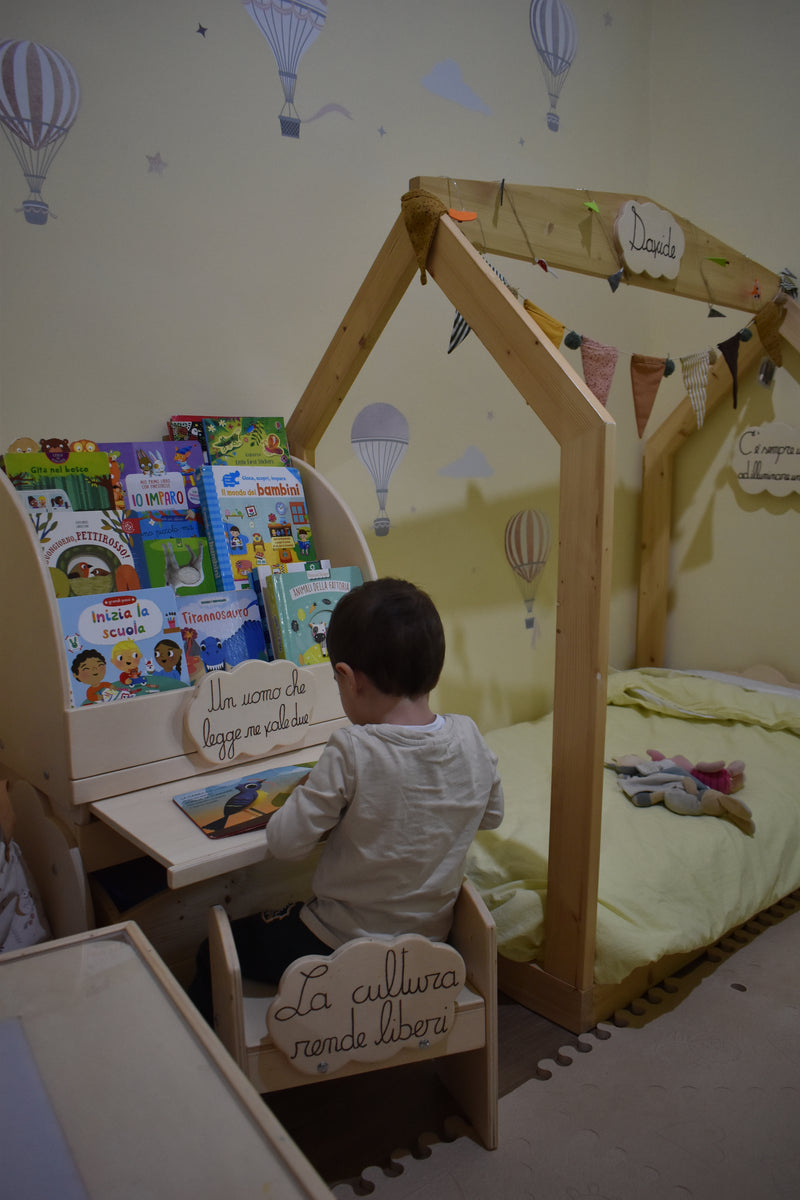 Un arredamento studiato per aiutare il bambino a sviluppare le proprie potenzialità assecondando i suoi bisogni di crescita. Avere un ambiente a sua misura invita il bambino ad agire, a compire un vero lavoro con un reale scopo pratico da raggiungere come ad esempio ordinare i propri libri e giochi.